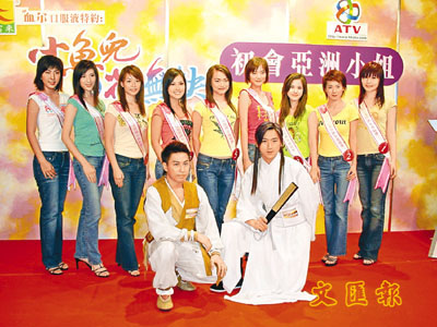【本報訊】「2005亞洲小姐競選」昨日舉行記者會,其中九位佳麗會見記者,活動上抽出三位佳麗2號吳勝男、3號袁詩媛和8號何淑敏,分別與男演員阮民俊和伍偉樂示範《小魚兒與花無缺》中的情節,考驗佳麗的演技,可是三位佳麗顯得很緊張,其中一場戲要3號袁詩媛大力打向阮民俊,然而她卻嬌柔地拍打。