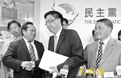 民主黨主席李永達(右一)聲言在匯標事件上自己沒有任何責任。張立新 攝