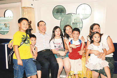 財政司司長唐英年在地鐵迪士尼專線車廂內與其他乘客合照。