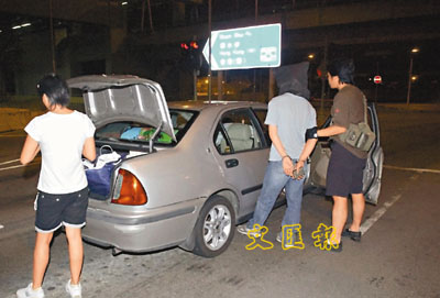 稍後,警員在東京街西近連翔道將車截獲檢查時,在行李箱的袋內發現8把纏有紗布的牛肉刀,遂以藏有攻擊性武器罪名拘捕兩人。初步調查,懷疑他們涉及黑社會活動,帶刀準備與同黨會合,疑準備進行黑幫廝殺。