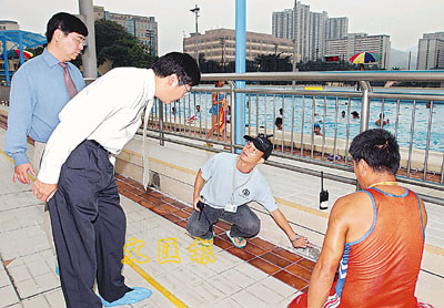 康文署助理署長(康樂事務)丘國賢(左二)巡視粉嶺游泳池,了解主池與副池間的石壆下的空隙發現少量紅蟲的情況。