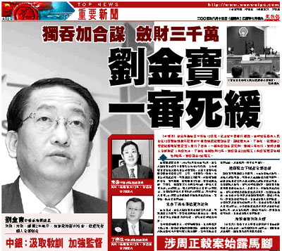 【本報訊】綜合新華社及中新社12日電:記者從中國銀行獲悉,吉林省長春市人民法院12日對涉嫌貪污犯罪的中銀香港原總裁劉金寶、副總裁朱赤、丁燕生、總裁辦公室原總經理張德寶等人進行了宣判,一審判處劉金寶死刑、緩期二年執行,並沒收個人全部財產;判處朱赤、丁燕生有期徒刑13年,並處罰金200萬元;判處張德寶有期徒刑8年,並處罰金150萬元。