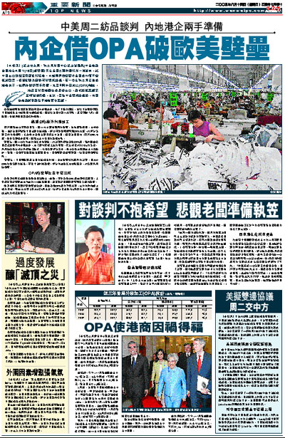 雖然面對這些不明朗因素,但一向以靈活見稱的港商,自有應對招數。范寧森說,由於美國只針對中國出產的紡織品,所以不少港商都利用OPA制度,將部分生產工序在港進行,之後再以香港出產身份出口美國,避開美國限制。雖然OPA制度,會令生產成本提高,但總比出口受限的影響為低。