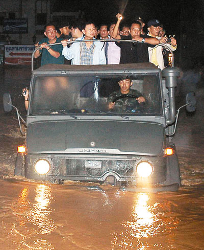 ■泰國總理他信(左二)到災區視察,亦要坐軍車涉水。 美聯社