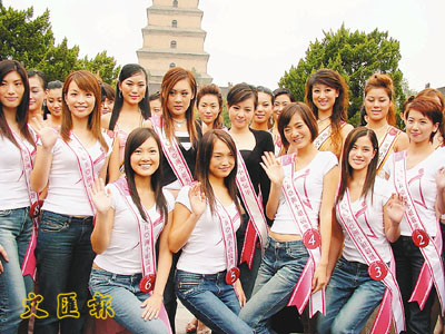 【本報訊】亞姐《2005亞洲小姐》的九位特區賽區及二十位內地賽區的佳麗,前日飛抵西安展開親善之旅。其中特區賽區的佳麗抵步後隨即到大慈恩寺會合內地賽區的佳麗進行參觀,並吸引大批遊客及本地人圍觀。