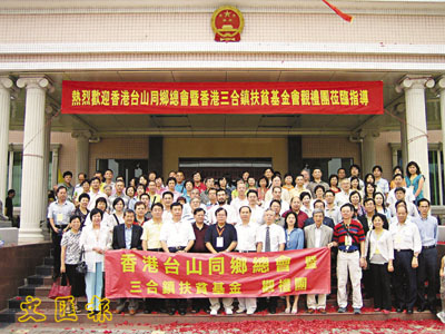 「香港三合鎮扶貧基金會」成立儀式,於三合鎮政府大樓隆重舉行,台山市委副書記周大健、副市長黃淑質、市政協副主席葉耀洪、市總工會主席駱愛珍、三合鎮委書記朱啟輝、鎮長余玉琛等多位領導蒞臨主禮,與該團首長共同主持儀式。周大健市委副書記、黃淑質副市長都讚揚該會的善行,彰顯了中華民族行善積德、濟災扶危的傳統美德。基金會是該市首個成立的慈善基金,啟動金額共21.3萬元。