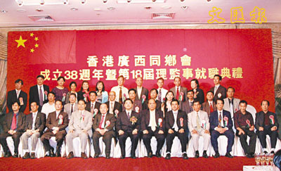 【本報訊】(記者 沈清麗)香港廣西同鄉會日前假尖沙咀美麗華酒店舉行成立38周年暨第18屆理監事就職典禮,及會員聯歡敬老大會。香港特區政制事務局局長林瑞麟蒞臨主持監誓及頒發聘任證書。連任理事長的張桂祥表示,新一屆理監事將繼續加強團結,出謀獻策,為廣西的經濟振興,社會和諧作出新貢獻。