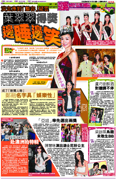昨日五位得獎港姐小休一晚後到尖沙咀某酒店與傳媒見面,大談得獎感受。冠軍葉翠翠坦言雖只睡了三個半小時,但仍精神奕奕,更自爆興奮得邊睡邊笑。她表示:「昨日在電視城做完訪問後便返家慶祝,而拍攝隊伍也跟隨我回家拍攝慶祝過程,之後我便與家人開大食會,到了清晨六時才上床就寢,雖然九時半我便起床,但好像睡了十二小時一樣,現時仍很精神!」