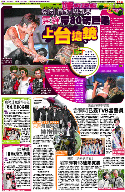 【本報訊】(記者 梁靜儀)達明一派與謝霆鋒首度合作的「同場異夢音樂會」,前晚假會展舉行,近年人氣不繼的霆鋒,為求搶鏡竟連家中的八十磅巨龜也要出動,又罔顧觀眾安危,突然飛身跳向觀眾席的觀眾,累及部分觀眾跌地上,幸好未有釀成意外。