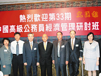 全國政協副主席霍英東、霍震寰和王雲瑞團長等在高級公務員研討班歡迎晚宴上合照。