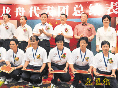 中國龍舟代表團領隊麥潤沾向大會報告了中國男、女子龍舟隊在比賽中團結拚搏,勇往直前,力壓群雄,奪得了成人組全部八項比賽中七項冠軍,一項亞軍,榮獲總分第一名的輝煌成績,為龍的故鄉中國爭了光的動人事跡,受到人們的高度讚揚。