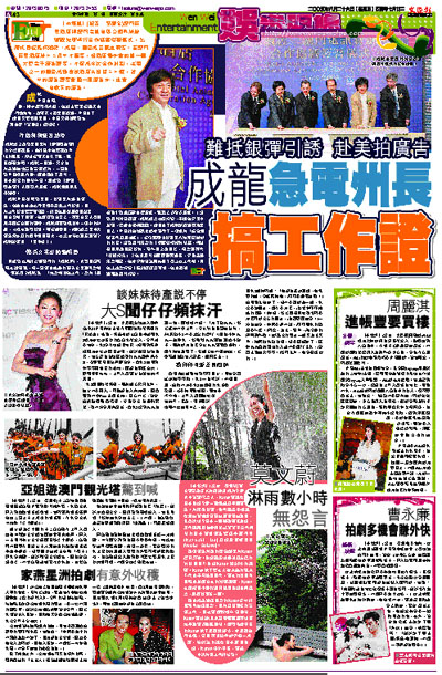另提到九月於上海舉行的「成龍杯」,大哥皺眉稱現在還很亂,但一直傳出抱恙的鄭秀文是否仍會做領航員?成龍說:「她會做其他工作,會為《長恨歌》到威尼斯出席影展,我就去多倫多影展。」談到澳門英皇酒店,成龍坦言有份投資,不過他只是小股東,怎樣也參與玩玩。活動完了成龍即返港轉飛美國去。昨日於旅遊觀光塔亦舉行了一個名為「憶念紹蓮畫作及雕塑展」,這位藝術家其實是八姑娘已逝世的女兒。談到澳門馬會的十年經營權續約問題,何鴻燊表示前晚已簽約,條件跟之前相若,但會否可作「雙邊投注」?他謂澳門方面隨時可接受,只看香港馬會而已,他亦只希望能維持數千員工有工作做。另他未來會投資十億於酒店及商場,他也歡迎港商來澳門投資。