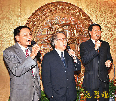 ■國共首次基層交流活動的雙方,在席間合唱《愛拼才會贏》。右為何立峰,中為沐桂新。中央社