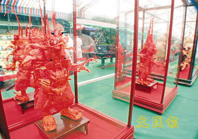 嘉義縣大士爺廟中元普渡祭典25日展開,廟方陳列的藝品展中,有一組「龍蝦戰士」,是餐廳廚師以蒐集的龍蝦外殼加以雕刻組裝而成,造型十分奇特。 中央社