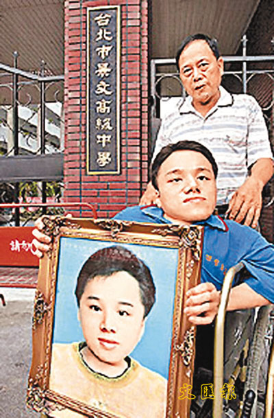 推著輪椅,顏爸爸帶著唯一的兒子到醫院做定期檢查,坐在輪椅上的是顏旭男的親哥哥顏凡韋(見圖),同樣也是「玻璃娃娃」,身體虛弱,5年來四處奔波,知判決結果,欣慰不已。5年前,他拿著弟弟的遺照,到景文高中控訴,他說,原本弟弟準備上體育課,當時老師因下雨,變更上課地點,到地下室,一名陳同學試圖抱顏旭男下樓,卻因天雨路滑,不慎跌下樓梯,弟弟被送醫急救仍重傷不治。