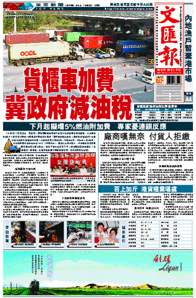 【本報訊】(實習記者 梁啟剛)面對國際燃油價格不斷攀升造成的經營環境困難,代表粵港近9成中小型運輸企業的15個團體昨聯合發表聲明,要求港府減免油稅;團體並建議於9月1日起向貨主收取陸路燃油附加費:本港貨運每公里加9角,跨境加6角,內地加人民幣5角。以葵涌至惠州為例將加收144元。團體代表黃基預計,附加費落實後每個櫃運費將提高僅4至5%,相信不會令貨運量下降;但有經濟觀察家擔心,這僅僅是一個開始,其他與油相關行業會紛紛跟隨,引發加價連鎖效應。