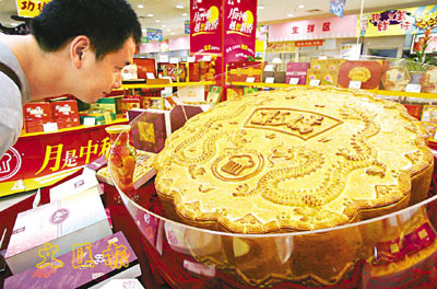 ■30日,價值3,800元人民幣、直徑1米、高20厘米、重約300公斤的巨型月餅亮相上海某超市。中新社