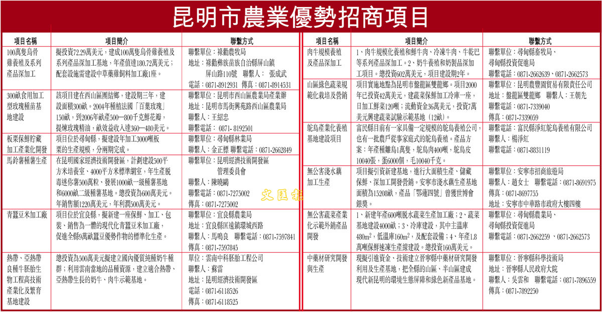 昆明市農業優勢招商項目 (圖)