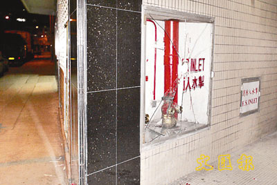 【本報訊】18歲姓夏青年,昨凌晨與女友途經新蒲崗六合街時,疑感情問題爭執,其間竟按捺不住,涉嫌以拳頭擊毀一工廠大廈外牆的消防喉玻璃門(見圖),導致手部受傷淌血,一隊警員巡經見狀,當場將夏拘捕,再召救護車到場將傷者送院。