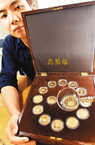 拍賣行會在周六拍賣一套12生肖及紀念英女皇訪港的紀念金幣。港英政府由1976年開始發行以12生肖為主題圖案的紀念金幣,直至1987年發行完畢。 這套金幣連同兩枚分別於1975年及1986年英女皇兩度訪港時發行的紀念金幣,由於金價經歷高低起跌,叫價曾一度高至40萬元,是次拍賣由12萬元起叫價。李志樑 攝