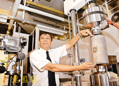 洪友仁介紹裝在樁柱上的「晶石感應器」,會因受壓而變色,可提供長期監察以防大廈倒塌。李志樑 攝