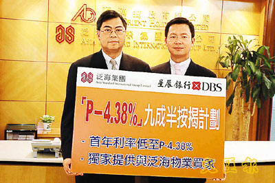 泛海國際執行董事關堡林表示,星展銀行為該集團之住宅物業買家提供之P-4.38%九成半按揭計劃,乃度身訂造,不但可減低供樓人士之利息支出,同時助置業人士更從容處理個人財務安排,置業倍輕鬆,對換樓人士有極大幫助。此按揭計劃適用於本集團屬下已發展之樓盤,同時包括未來推出之住宅新盤,例如:鯉魚門高級住宅項目及屏山項目等同樣可以受惠。優惠期至2005年11月30日。