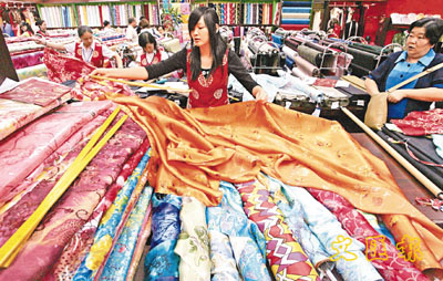 ■北京的一家紡織品店內,商戶正向客戶推銷布料。發改委最新報告顯示,中國的出口高速增長將逆轉。 路透社