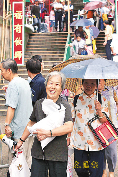 ■位於山邊的地藏王廟派米,長者冒雨拾級而上,才可領得一包平安米。 張立新 攝