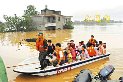 ■4日4時30分,位於江西省九江市永修縣和南昌市安義縣的潦河青湖圩潰決,1萬多人被緊急轉移,2人失蹤。圖為武警駕駛衝鋒舟轉移被洪水圍困的群眾。 新華社