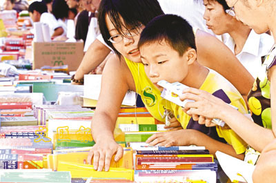 4日,浙江省紹興市第二屆「全民讀書月」活動在城市廣場拉開序幕,讀書愛好者正在書展上專心選購書籍。 新華社