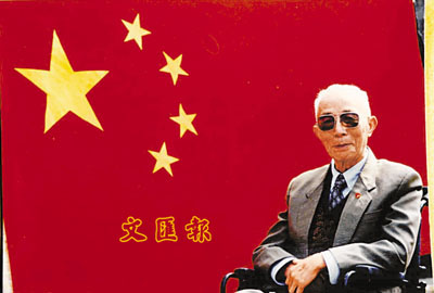著名老作曲家—王莘,坐在天安門廣場管委會送給他的2000年10月26日升起的國旗前留影。