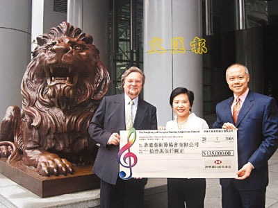 匯豐銀行慈善基金諮詢委員會秘書黃彬(中)頒贈支票予香港藝術節發展委員會主席梁偉賢(右)及香港藝術節行政總監高德禮(左)。