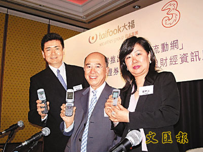 大福證券同3香港合作推出「大福3G活動網」。左起︰大福應德信、黃紹開、3香港龍佩英。