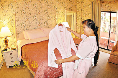 皇家夏威夷酒店的嘉珊正為顧客準備浴袍。美聯社