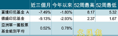 印尼盾兌美元不但在兩周內貶值達6%,股市亦受連累在8月間重挫逾12%,創下2000年5月以來最大單月跌幅。近三個月表現較抗跌的富達印尼基金,基金在2002、2003和2004年表現分別為-32.26%、66.7%及35.64%,基金最差季度收益和標準差為-51.51%及27.85。