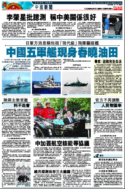 【本報訊】據中央社9日電:日本海上自衛隊巡邏機今天確認,包括飛彈驅逐艦在內的5艘中國軍艦在春曉油田附近的海面航行,這是中國軍艦首度被確認出現在這個油田附近。