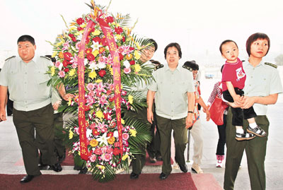 9日是毛澤東逝世29周年紀念日,毛澤東一歲九個月的重孫毛東東依偎在母親劉濱的懷中首次亮相北京毛主席紀念堂,毛東東的父親毛新宇(左一,毛澤東唯一的孫子)、奶奶邵華(左三,毛澤東的兒媳)等一同到毛主席紀念堂敬獻花籃。 中新社
