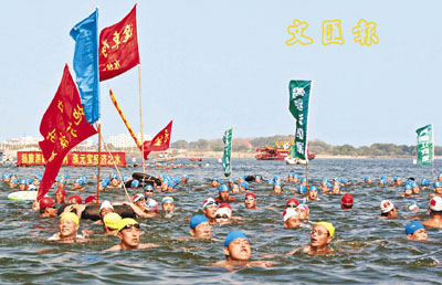 10日,遼寧丹東市組織各單位進行一年一度的暢游鴨綠江表演。他們以單位為方陣,用巨大的標示牌或彩旗作先導,一邊喊著口號一邊前行,展示各自的形象。 中新社