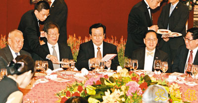 ■左起:董建華、廖暉、曾慶紅、曾蔭權、高祀仁在宴會上交談。潘達文 攝