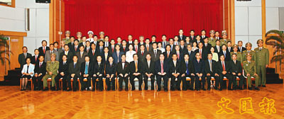 ■國家副主席曾慶紅與中央駐港機構官員及在港中資企業代表會晤。圖為曾副主席(中)及行政長官曾蔭權於會晤後與主要負責人們合照。