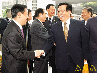 ■曾慶紅和彭清華副主任親切握手。 中新社