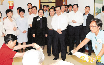 ■曾副主席一行在護理中心觀看老人們做毛巾操。 新華社