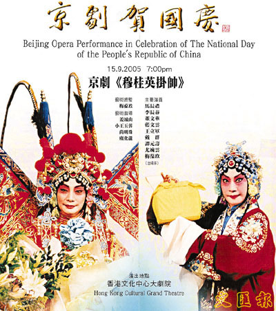 【本報訊】(記者 張萍)由香港蘇浙滬各界人士聯合舉辦的慶祝國慶56周年、香港回歸8周年等系列慶典活動,將於本月15日在尖沙咀香港文化中心大劇院隆重舉行,特區政府行政長官曾蔭權、中聯辦主任高祀仁、外交部駐港公署特派員楊文昌、上海統戰部部長沈紅光將親臨主禮。為使今年慶國慶活動更加豐富多彩,輪值承辦機構上海總會精心策劃了一場大型傳統京劇《穆桂英掛帥》招待本港各界友好、各國駐港總領事館官員和家屬。