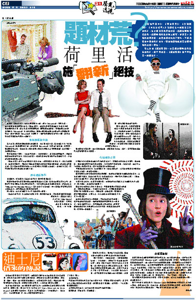 《搞鬼甲蟲車》、《雨夜閃靈》、《監獄瘋球》、《朱古力獎門人》等最近在本港戲院公映的影片,其共通點是非原創作品,或翻拍經典電視劇集,或經典電影重新搬上銀幕,甚至是小說電影的再改編。荷里活題材荒說了數年,不但改編自外國的影片日多,連自家壓箱底的黑白經典電影也逐一再造。