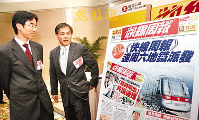 星島新聞集團主席何柱國出席「 快線周報」 創刊記者會。左為地鐵市務及車站商務總經理劉天成。 趙焜崗 攝