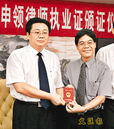 【本報珠三角新聞中心記者鄭海龍通訊員楊湧、王紅深圳電】昨日,北京金城同達律師事務所深圳分所港人吳志強,從深圳司法局石崗副局長手中接過由廣東省司法廳頒發的律師執業證,成為粵省首位獲准在內地執業的港澳居民。他表示,從事內地非訴訟法律事務後,將為居深港人提供更適切的法律服務。