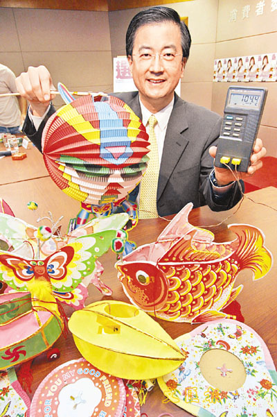 吳馬太展示一些摺合式燈籠,其懸掛點的溫度測試結果高於一百度。 羅蘭蓉 攝
