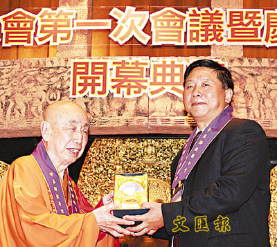 ■覺光長老致送紀念品予葉小文(右)。