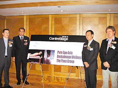 左起:Che Taylor、Raju Harilela、恆基謝偉銓、Colvin Brown推介聚賢居會所水療。張以正 攝