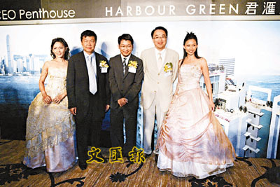 周國賢(右二)、麥孟添(中)、楊祖賜(左二)與舞蹈員一起推介國際級品牌住宅君匯港。 張偉民 攝